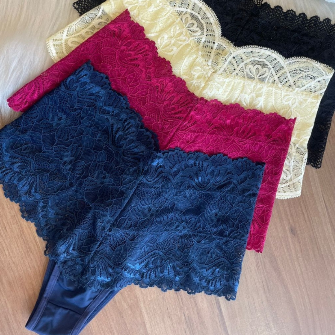 Calcinha cintura alta em renda e microfibra