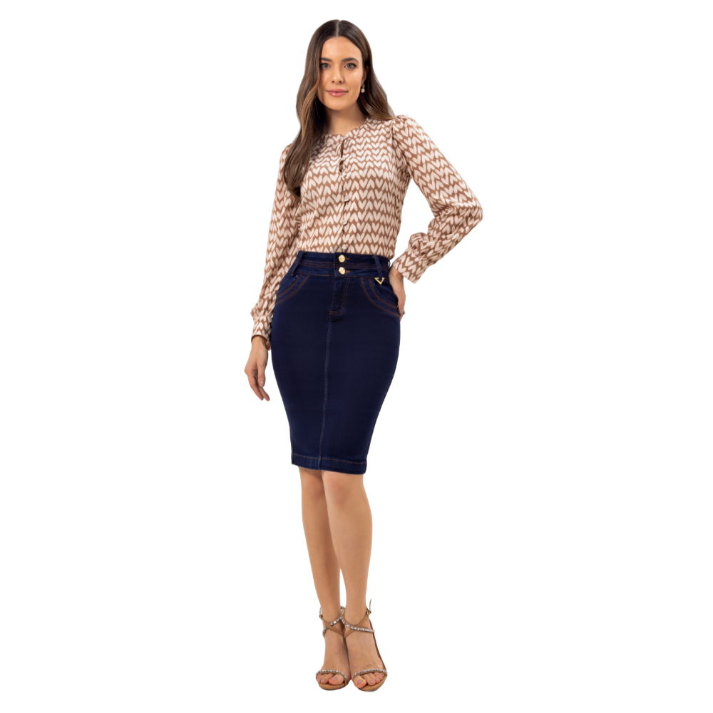 Saia Tradicional Jeans – Botões Frontais e Costuras em Destaque