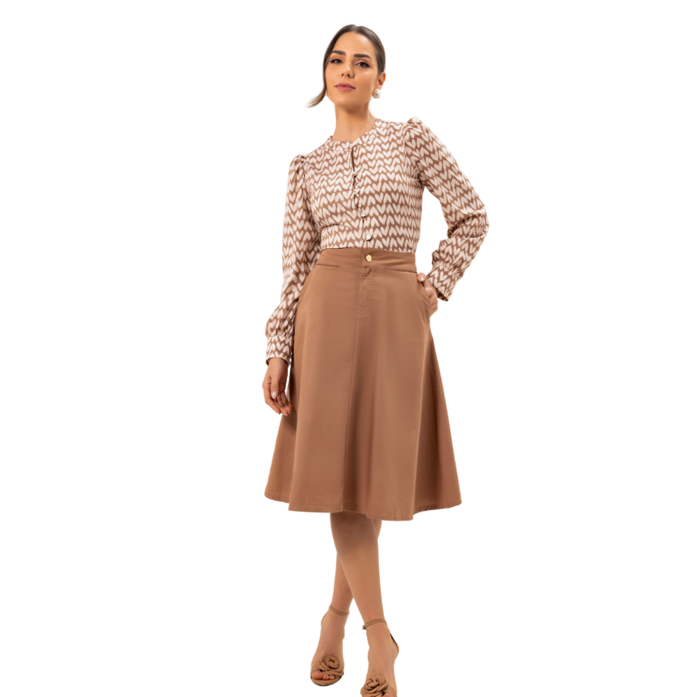 A Saia Godê Laura Rosa em Sarja Collor – Ocre é perfeita para mulheres que valorizam sofisticação e praticidade em uma só peça. Confeccionada em sarja collor de altíssima qualidade, conta com lavanderia tingida no tom ocre, tendência da estação, que garante versatilidade e elegância em diferentes combinações.
