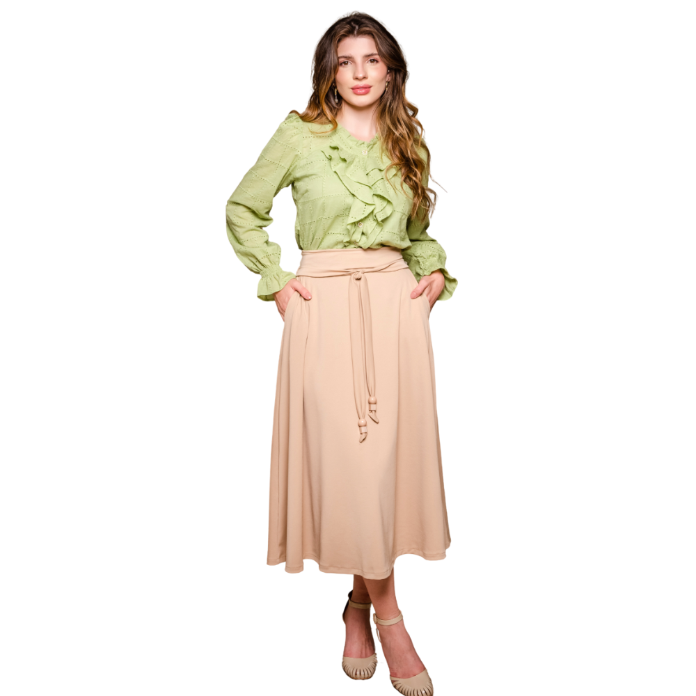 A Saia Midi D’azul com Elástico na Costa é a peça que une conforto e sofisticação em um único design. Confeccionada em tecido de alta qualidade, possui comprimento midi que alonga a silhueta e oferece um caimento impecável. O detalhe do elástico na parte traseira garante maior ajuste ao corpo e liberdade de movimentos, sem perder a elegância. Versátil, pode ser combinada com blusas leves, camisas de alfaiataria ou tricôs, permitindo criar produções que vão do casual ao sofisticado.